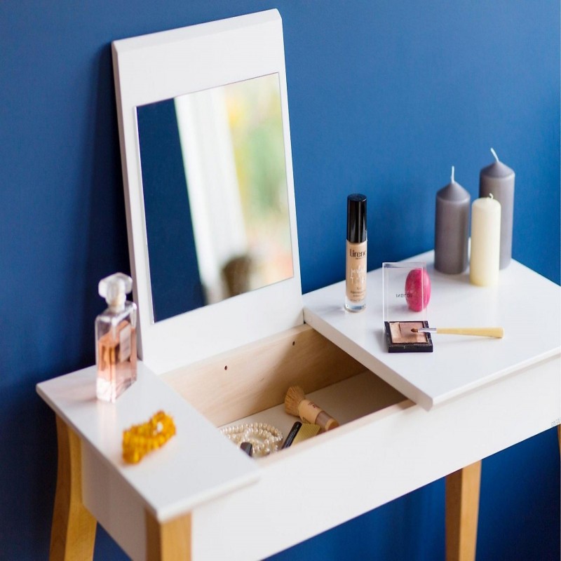 La coiffeuse est en bois de hêtre et en MDF laminé et laqué. Cela en fait non seulement un meuble magnifiquement conçu, mais aussi un produit durable. Les pieds colorés sont finis dans une couleur noire élégante et le plateau de la table a une épaisseur de 19 mm, ce qui donne un aspect robuste et solide.