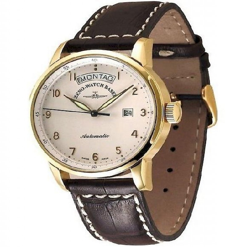 Marque : Zeno Watch Basel Groupe de produits : Montres Groupe cible : Hommes Couleur du boîtier : or jaune Verre : verre saphir Matériau du bracelet : cuir ? Mm : 42 Matériau du boîtier : acier inoxydable Couleur du cadran : blanc ? Autre : arrière de l'écran Autre : Swiss Made Affichage : analogique Couleur du bracelet : marron Surface du revêtement : poli Forme du boîtier : rond Type de montre : montres automatiques Type de mouvement : automatique Type de fermeture : boucle ardillon