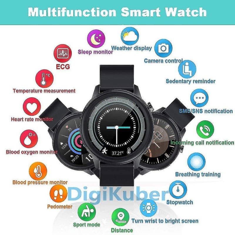 DIFFÉRENTES FONCTIONS telles que l'affichage de l'heure et de la date, l'affichage de la météo, la notification d'appel et de message, le compteur de pas, l'enregistrement de la consommation de calories, l'enregistrement du kilométrage sportif, 7 modes sportifs, moniteur de fréquence cardiaque, diagnostic ECG / PPG / Ai, contrôle de la caméra, moniteur de sommeil, rappel de sédentarité, chronomètre, entraînement respiratoire.MONITEUR DE TEMPÉRATURE CORPORELLE 24 HEURES Vous pouvez mesurer votre température corporelle pendant 24 heures, les données de température corporelle peuvent être enregistrées dans l'application [SmartHealth], vous pouvez surveiller votre température corporelle et surveiller votre santé à tout moment.GESTION DU SPORT ET DE LA SANTÉ Suivi de la mesure de plusieurs données sportives et de santé : mode multisport, podomètre, distance, calories ; Diagnostic ECG / PPG / AI / moniteur de fréquence cardiaque. Faites attention à votre santé tout le temps. Les données de sport et de santé de la montre intelligente sont uniquement à titre de référence, veuillez écouter les conseils du médecin.MONITEUR DE SOMMEIL ET AFFICHAGE MÉTÉO Fonction de surveillance du sommeil : lorsque vous vous endormez, la montre intelligente calcule automatiquement la qualité de votre sommeil, synchronise les données avec l'application. Vous pouvez connaître la qualité du sommeil. La fonction d'affichage météo affichera les informations météorologiques actuelles et la qualité de l'air. (Remarque : vous devez obtenir les informations de localisation de votre téléphone pour afficher la météo).IP68 IMPERMÉABLE ET CHARGE MAGNÉTIQUE IP68 a d'excellentes performances d'étanchéité et peut répondre à la plupart des besoins quotidiens. (Remarque : ne pas tremper dans l'eau profonde pendant une longue période. Ne le portez pas non plus dans les sources chaudes et les bains chauds.) Chargement par aspiration magnétique, le temps de charge est d'environ 3 à 4 heures, le temps d'utilisation est d'environ 5 à 13 jours, en veille 20 à 40 jours.